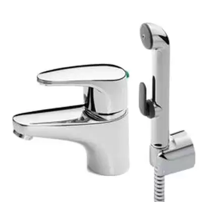 Смеситель для раковины ORAS Vega 1812F с гигиеническим душем. Его прочная рукоятка оснащена эко-кнопкой для ограничения температуры и расхода воды.