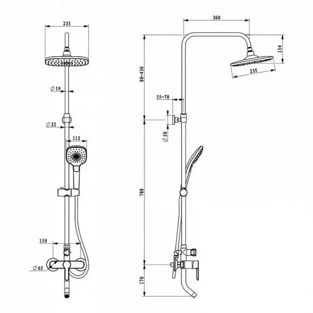 - Диаметр лейки: ручная лейка - 112мм, верхний душ - 235мм