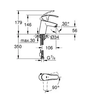 - Подводка воды: гибкая 350 мм с накидной гайкой 3/8 дюйма