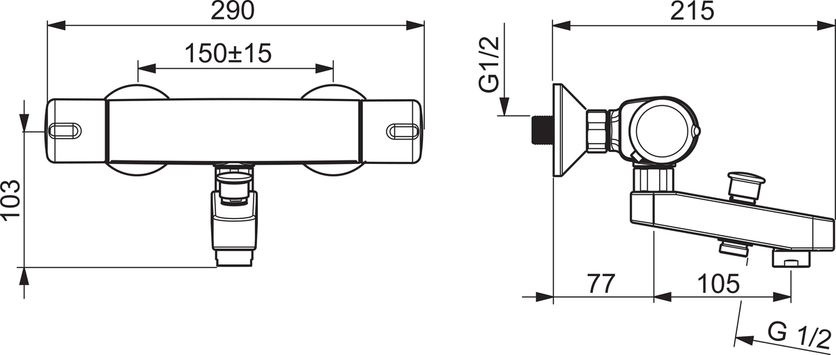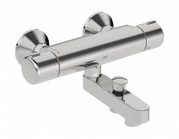 Термостатический смеситель для ванны и душа. Подключение горячей воды с правой стороны.Ограничитель температуры воды на 38°C на рукоятке. Контроль за расходом воды EcoFlow. В комплект входят обратные клапаны и грязевые фильтры. В комплект входит излив (221200) с дивертером.