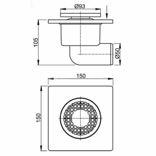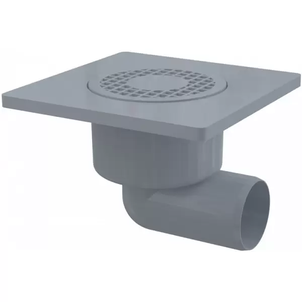 Сливной трап 150 × 150/50, подводка – боковая, решетка – серая, гидрозатвор – мокрый.