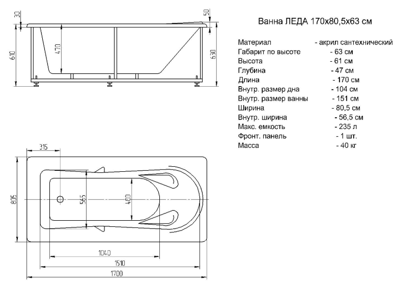 Купить Акриловая ванна Леда 170х80 LED170-0000143 Aquatek артикул: 226082 в интернет-магазине ESMAG - Челябинск.