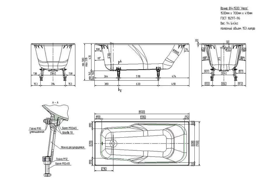 Купить Ванна чугунная Универсал 1500х700 Российский Стандарт Нега с отверстиями под ручки артикул: 45644 в интернет-магазине ESMAG - Челябинск.
