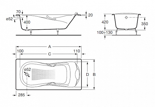 Ванна чугунная HAITI 1600х800 с отв. для ручек 23307000R