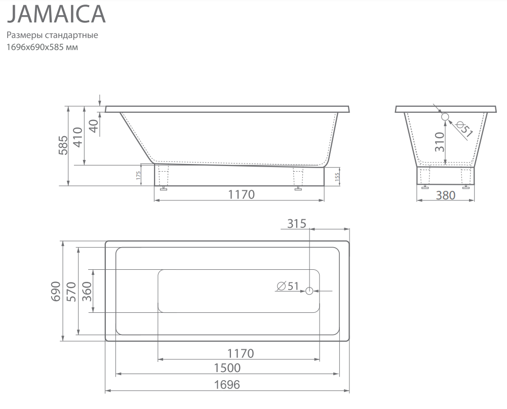 Купить Белая ванна мраморная JAMAICA 1696х690х585 артикул: 64318 в интернет-магазине ESMAG - Челябинск.