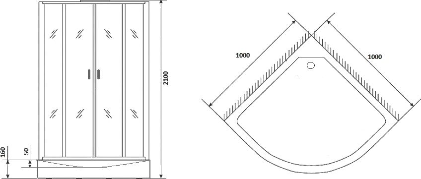 Двери и переднее стекло: Прозрачные 6 мм, двери зарываются плотно с помощью магнитной ленты, вода не выплёскивается так как установлены брызговики между дверью и неподвижной стенкой. Ручки дверей железные. Ролики стальные и надежные.