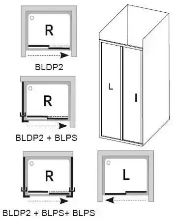 В соединении с душевыми стенками BLPS создается неподвижный душевой уголок Г-формы. Две неподвижные стенки BLPS и душевые двери BLDP2, комбинируются в П-образный душевой уголок. Изделие монтируется в угол или нишу, или на пол, в комплекте с душевыми каналами.