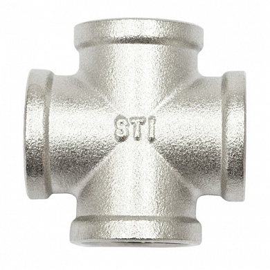 Латунный никелированный четырехсторонний фитинг STI, равнопроходной с внутренней резьбой. Используется для соединения между собой водопроводных, отопительных и других видов труб.