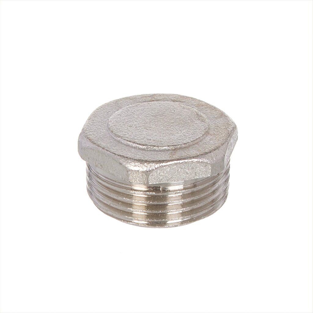 Латунная никелированная трубопроводная заглушка с шестигранной головкой. Имеет внутреннюю резьбу.